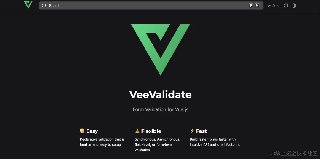 vee-validate 是Vue.js的表单验证库,它允许验证输入并以熟悉的声明式样式或使用组合函数构建更好的表单 UI。