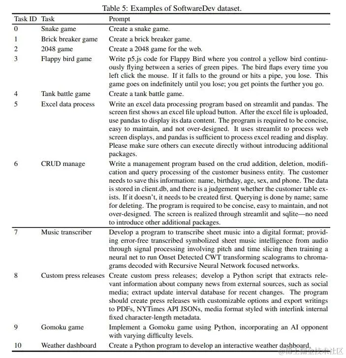 2)MBPP 包含 427 个 Python 任务。这些任务涵盖核心概念和标准库功能,并包括说明、参考代码和自动测试。 - 我们提出了更具有挑战性的软件开发任务的基准数据集 SoftwareDev:我们的 SoftwareDev 数据集收集了 70 个具有代表性的软件开发任务实例,每个实例都有自己的任务提示(见论文表 5)。这些任务的范围多种多样(见论文图 5),如迷你游戏、图像处理算法、数据可视化等。它们为真实的开发任务提供了一个强大的测试平台。与之前的数据集不同,SoftwareDev 侧重于工程方面。在比较中,我们随机选择了七个具有代表性的任务进行评估。