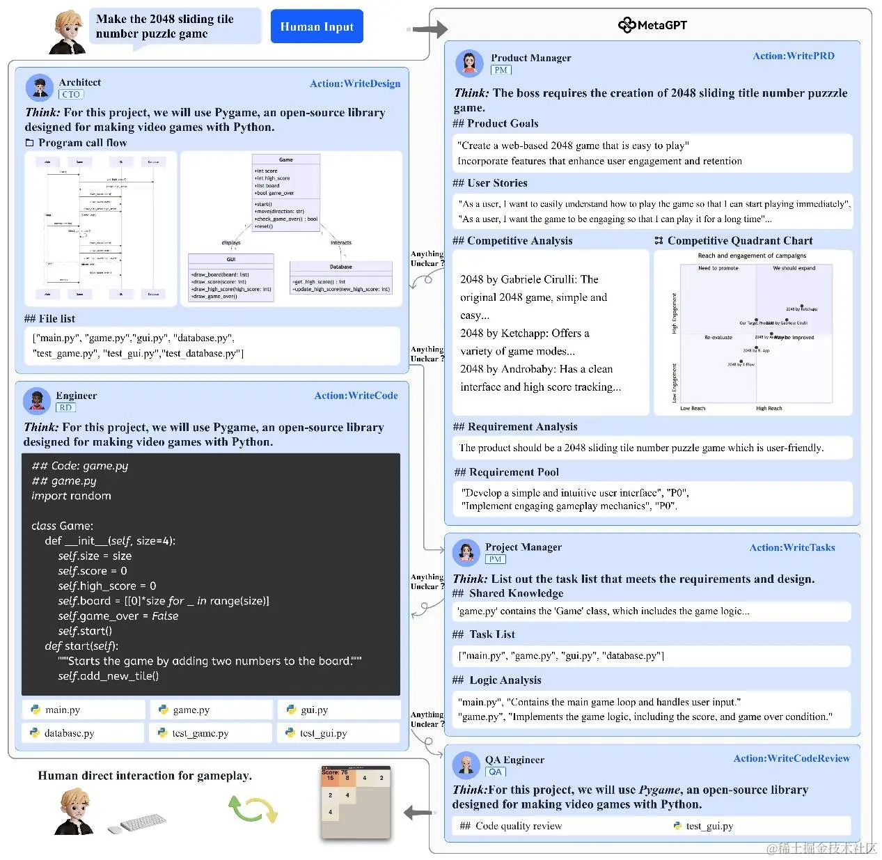 因此,结构化的通信内容和接口形式有助于智能体之间进行快速准确的任务要求理解,也有利于信息内容的最大化保留。参考人类 SOPs 中对不同岗位的角色要求,我们给每个角色设定了符合人类对应岗位专家的输出规范,要求智能体将原始自然语言信息转换为更结构化的表达(如下图所示),如数据结构、API设计和时序图。