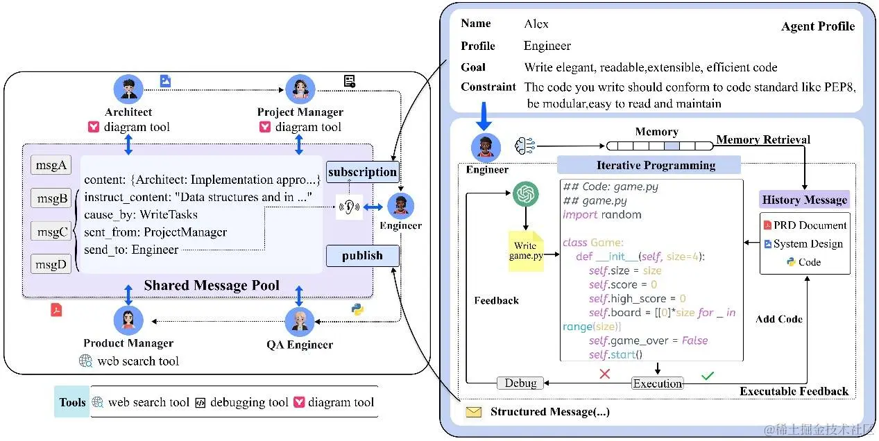 Fig.2. 通信协议示例(左)和运行中可执行反馈的迭代编程示例(右)。左图:Agents使用共享消息池发布结构化消息。它们还可以根据自己的配置订阅相关消息。右图:生成初始代码后,工程师Agent可执行代码并检查运行中是否报错。如果出现报错,Agent会检查执行结果,并将它们与 PRD、系统设计和代码文件进行比较,进行代码的重写和优化。
