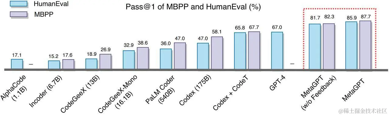 图 4 表明,MetaGPT 在 HumanEval 和 MBPP 基准测试中均优于之前的所有方法。当 MetaGPT(使用 GPT-4 作为基础模型),与 GPT-4 相比,它在 HumanEval 基准测试中的 Pass @1 显著提高。它在这两个公共基准测试中达到了 85.9% 和 87.7%(考虑到实验成本,部分模型的数值结果直接使用的 Dong et al. (2023). 所提供的结果 [6])。