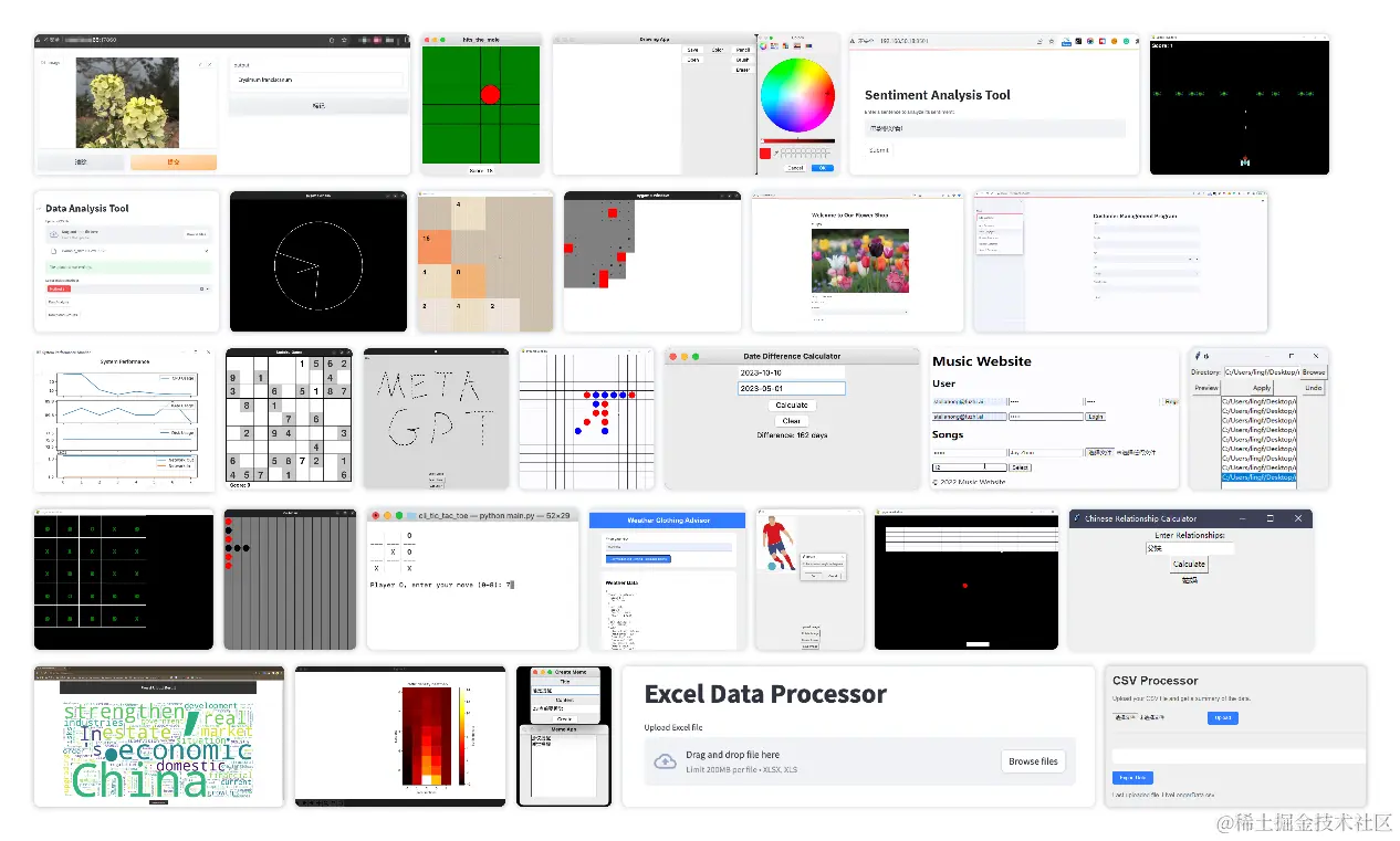 对于 SoftwareDev,我们优先考虑生成项目的实际可用性,并通过人工评估(A、E)或统计分析(B、C、D)来评估性能,我们通过可视化示例展示了 MetaGPT 的自主软件生成能力(论文图 5)。有关其他实验和分析,可参阅论文附录 C: