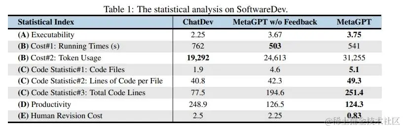 如论文表 1 所示,在具有挑战性的 SoftwareDev 数据集上,MetaGPT 几乎在所有指标上都优于 ChatDev。