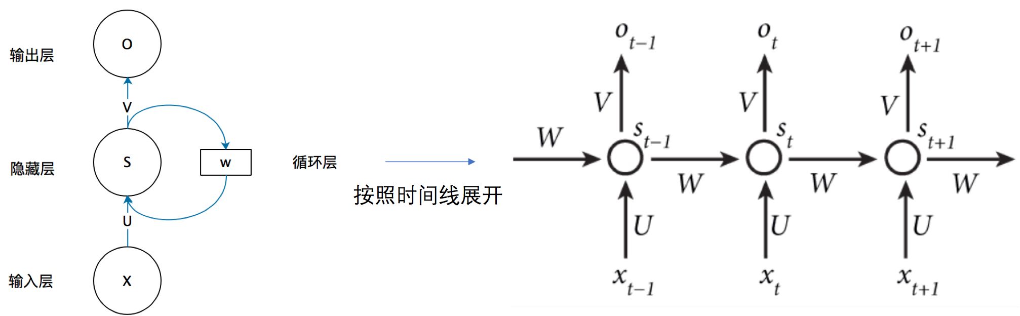 循环神经网络的隐藏层的值s不仅仅取决于当前这次的输入x,还取决于上一次隐藏层的值s。权重矩阵 W就是隐藏层上一次的值作为这一次的输入的权重。