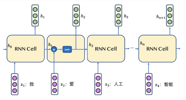 从图上可以看出,RNN在每个时刻均会接收两个输入,一个是当前时刻的单词,一个是来自上一个时刻的输出 ,经过计算后产生当前时刻的输出。例如在第2个时刻,它的输入是”爱”和,它的输出是;在第3个时刻,它的输入是”人工”和, 输出是,依次类推,直到处理完最后一个单词。