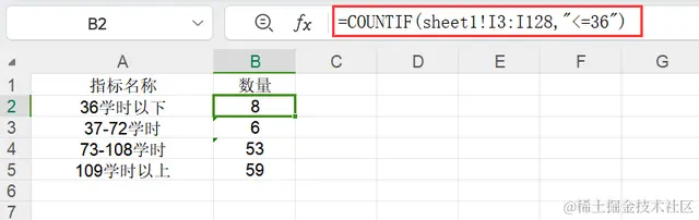 公式如下:=COUNTIF(sheet1!I3:I128,"<=36")