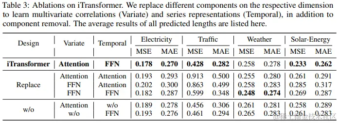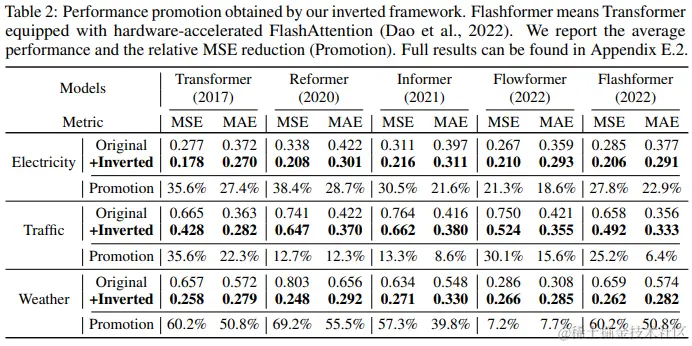 表 2 对 Transformers 和相应的 iTransformers 进行了评估。值得注意的是,该框架持续改进了各种 Transformer。总体而言,Transformer 平均提升了 38.9%,Reformer 平均提升了 36.1%,Informer 平均提升了 28.5%,Flowformer 平均提升了 16.8%,Flashformer 平均提升了 32.2%。