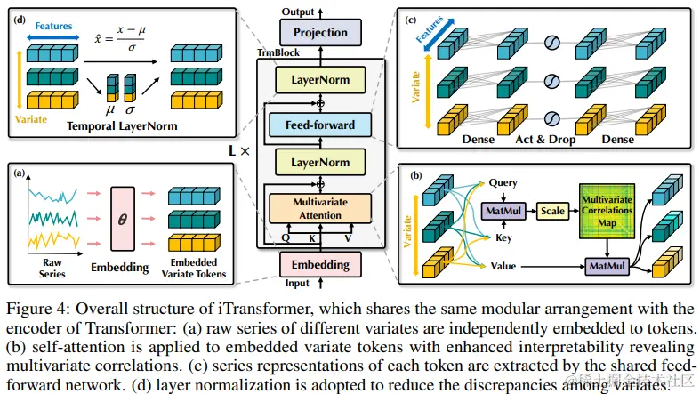 图 4 中所示的 iTransformer 利用了更简单的 Transformer 纯编码器架构,包括嵌入、投影和 Transformer 块。