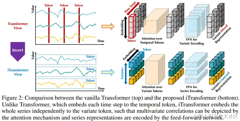 关于将每个时间步的多变量点嵌入一个(时间)token 的不合理性,研究者从时间序列的反向视角出发,将每个变量的整个时间序列独立嵌入一个(变量)token,这是扩大局部感受野的 patching 的极端情况。通过倒置,嵌入的 token 聚集了序列的全局表征,可以更加以变量为中心,更好地利用注意力机制进行多变量关联。同时,前馈网络可以熟练地学习任意回溯序列编码的不同变量的泛化表征,并解码以预测未来序列。