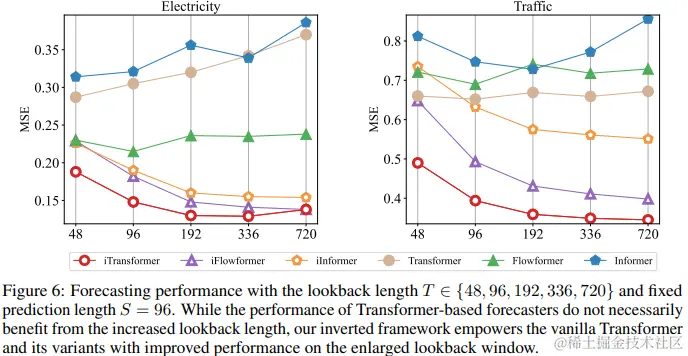 由于注意力和前馈网络的职责是倒置的,图 6 中评估了随着回视长度的增加,Transformers 和 iTransformer 的性能。它验证了在时间维度上利用 MLP 的合理性,即 Transformers 可以从延长的回视窗口中获益,从而获得更精确的预测。