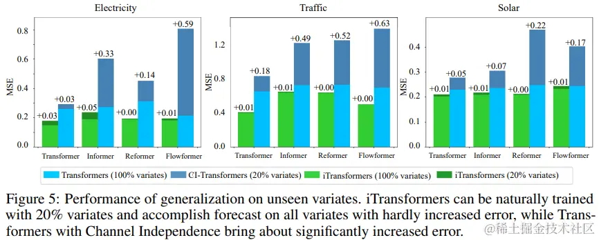 为了验证假设,研究者将 iTransformer 与另一种泛化策略进行了比较:Channel Independent 强制采用一个共享 Transformer 来学习所有变体的模式。如图 5 所示, Channel Independent(CI-Transformers)的泛化误差可能会大幅增加,而 iTransformer 预测误差的增幅要小得多。