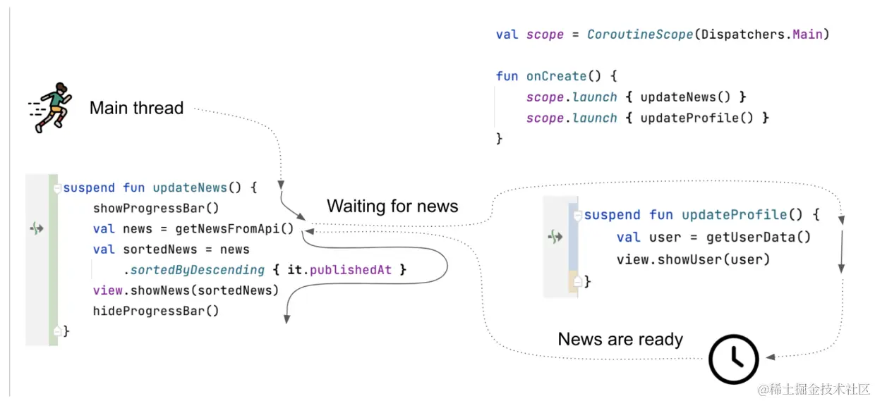这段代码几乎与我们一开始想要的完全相同!在此解决方案中,代码在主线程上运行,但从不阻塞它。由于挂起机制,我们在需要等待数据时挂起(而不是阻塞)协程。当协程被挂起时,主线程可以做其他事情,比如绘制美丽的进度条动画。一旦数据准备好了,我们的协程再次占用主线程,并从先前停止的地方开始执行。