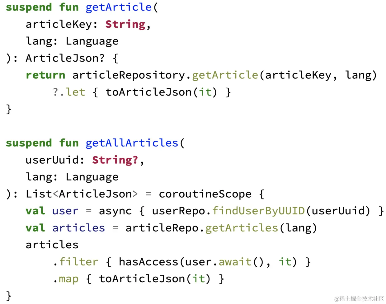这段代码确实是并发的,并且没有内存泄漏,但我们需要引入RxJava函数,例如zip和flatMap,将一个值打包成Pair,然后解构它。这是一个正确的实现,但非常复杂。因此,最后让我们看看协程为我们提供了什么。