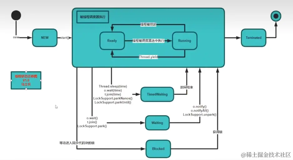 对于Java来说,对其左了封装,大致将可运行和运行合并为RUNNABLE,将休眠状态分解为WAITING、TIMED_WAITING、BLOCKED,还有一个注意点: