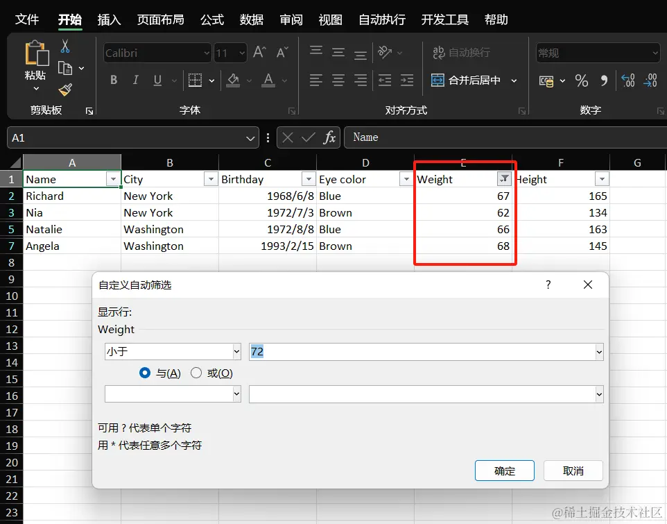 可以看到 Weight 列被过滤,条件为小于 72 的结果。在上面的代码中,要注意 autoFilter(4, "<72");中的 4 指的是第 5 列,GcExcel 是从 0 开始计算的。
