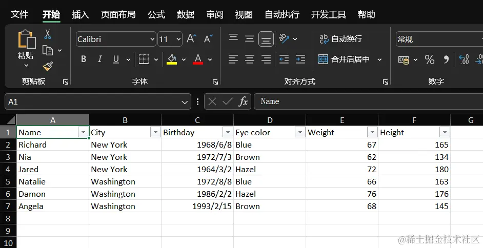 {"Name", "City", "Birthday", "Eye color", "Weight", "Height"},