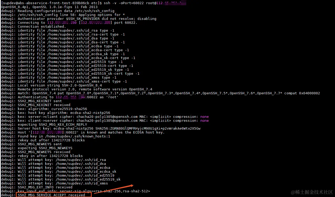 ◦ 假如调试信息卡在debug1: SSH2_MSG_SERVICE_ACCEPT received位置,则表示主要的耗时卡点在服务端,需要修改服务端的配置文件();