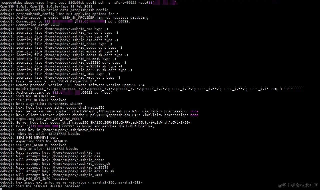 - 首先使用ssh -v命令(调试模式)进行远程登录调试: