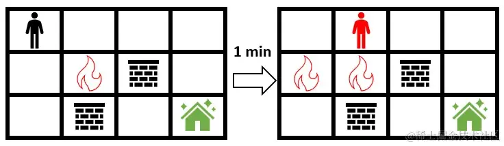 BFS,按照「先火后人」的方式,同步模拟「火势蔓延」和「人员移动」过程。普通位置,只要火势蔓延到,那么人将无法移动到此处;安全屋位置,需要判断是否与火势同一时刻到达。