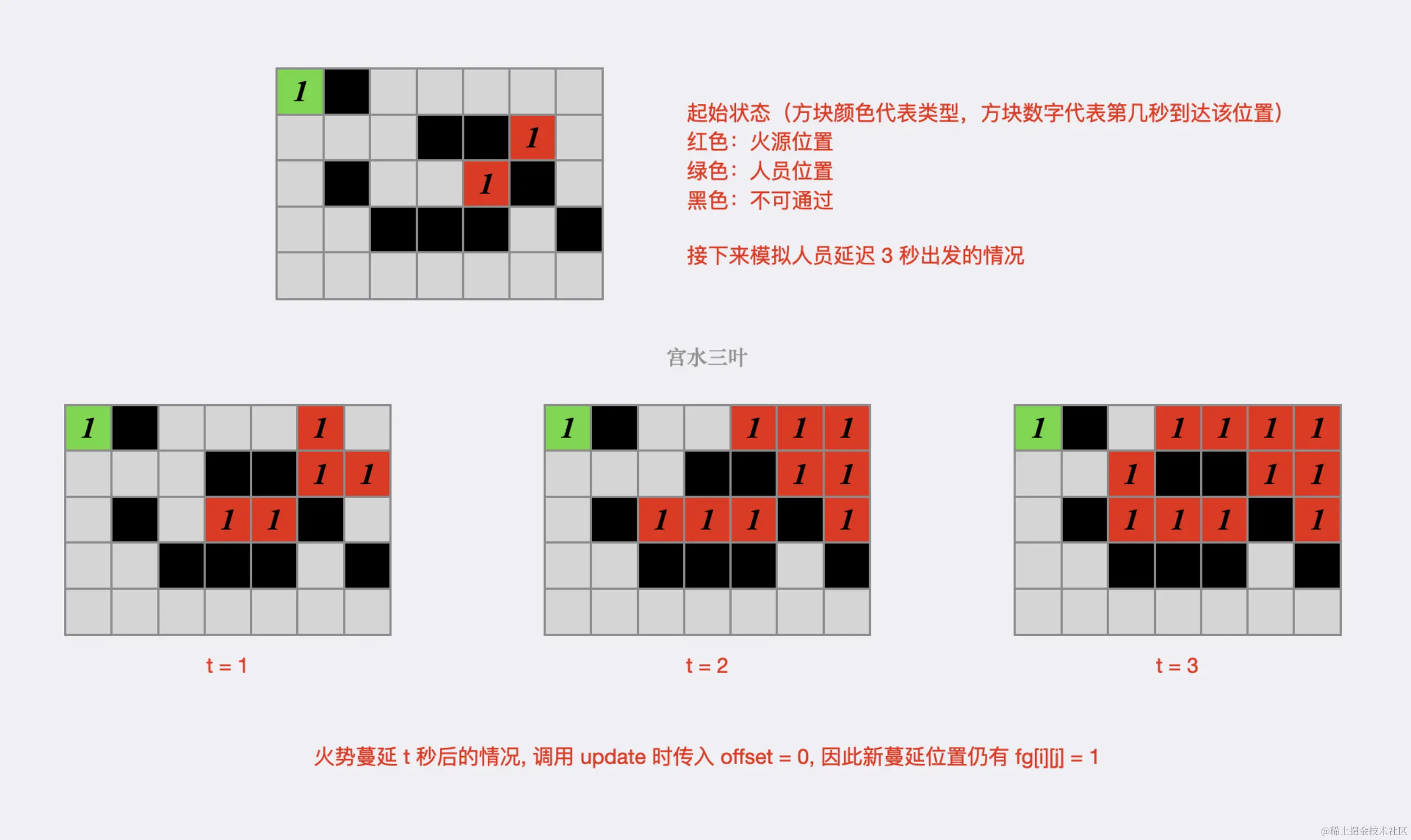 BFS,模拟 秒的火势蔓延,火势在这 秒内所蔓延到的新位置,均看作为起始火源,即有 。若执行完 秒后,火势已蔓延到人员起始位置 ,那么延迟 秒出发不可行,直接返回