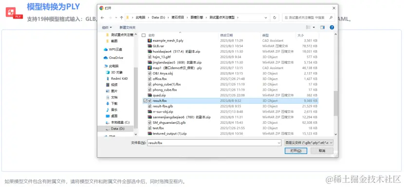 FBX转PLY网站也支持通过拖拽的方式,将文件进行上传。在资源管理器中,选择一份或多份模型相关文件,拖拽至FBX转PLY网站中的文件接收区域,即可完成3D模型文件的上传。