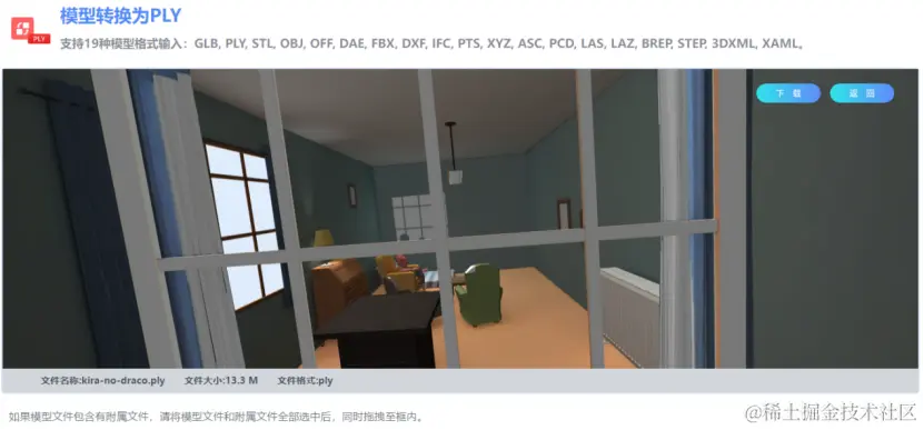 通过FBX转PLY网站生成的下载链接,可以将PLY格式的模型文件下载到本地。生成的下载链接24小时内有效,超时将不能下载,需要及时下载文件。