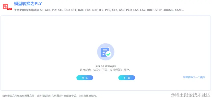 在FBX转PLY网站完成模型格式转换完成后,此时可以在线预览模型转换结果,可以直接下载转换结果,也可以继续转换下一个模型。