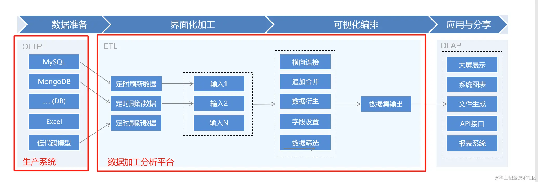 数据应用的基本流程大致分为三个步骤,数据的集成接入(多种数据源)、数据的清洗加工(关联、筛选、分组聚合等),最后再是数据的应用(数据报告、趋势图表、大屏展示、统计报表等)。