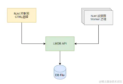 OpenNJet KV Store 的实现上,使用了轻量级的内存数据库 LMDB。LMDB是基于内存映射的,效率高,并且访问简单,不需要单独的数据管理进程,只要在访问代码里引用LMDB库。LMDB的文件结构简单,包含一个数据文件和一个锁文件,通过锁控制来实现事务隔离,LMDB文件可以同时由多个进程打开。使用该方案,整体架构简单清晰。
