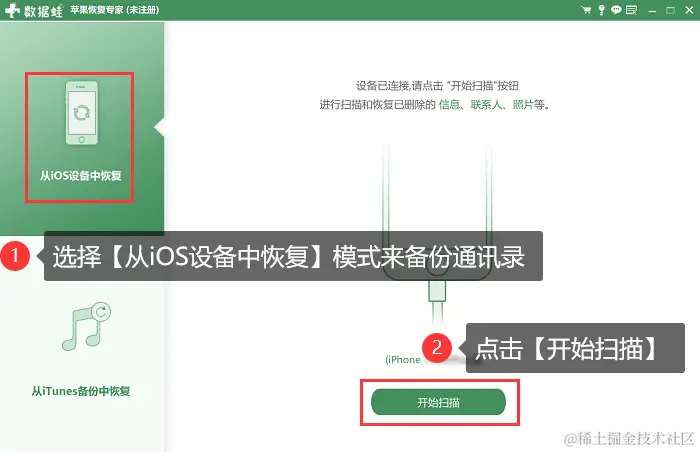 数据蛙苹果恢复专家是一款专门针对苹果设备数据恢复的软件,它可以大概率帮助您备份和恢复iPhone、iPad、iPod touch上的各种数据,包括照片、短信、视频、聊天记录、通讯录联系人等等。只需要简单几个步骤,您就可以将通讯录里联系人的信息备份到电脑上。