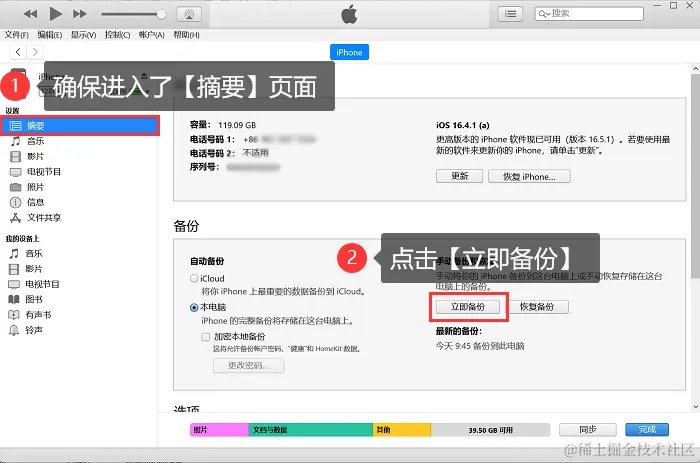 步骤3:等到iTunes识别到手机后,点击iTunes上的设备图标,然后在【摘要】页面点击【立即备份】,即可将手机上的通讯录等数据备份到电脑上。