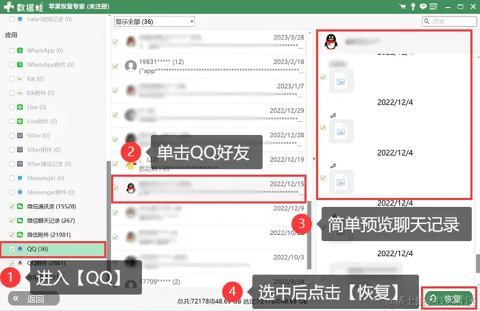 步骤4:在扫描完成后,你将看到所有能扫描到的数据。在【QQ】里选择你想要恢复的聊天记录,点击【恢复】按钮即可将其保存在电脑上。