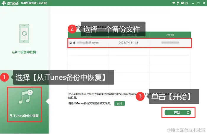 步骤1:返回软件首页,选择【从iTunes备份中恢复】模式,然后在列表中挑选一个备份文件,最后单击【开始】按钮。