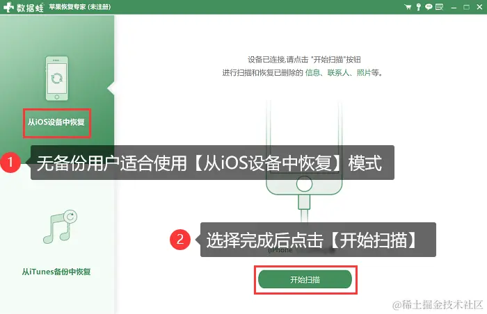 步骤3:在软件首页面,选中【从iOS设备中恢复】这个模式,然后单击【开始扫描】按钮,软件将自动执行扫描操作。