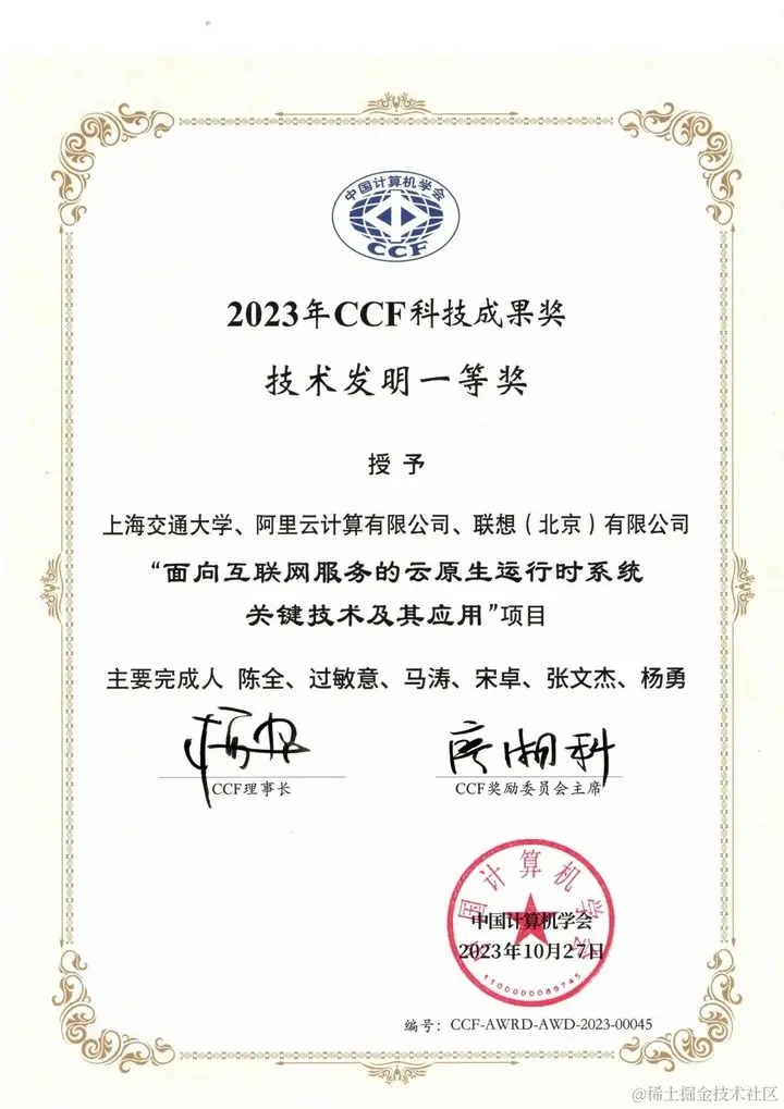近日,中国计算机学会(CCF)公布了 2023 年度“CCF 科技成果奖”获奖名单,上海交通大学联合龙蜥社区理事长单位阿里云等公司,凭借“面向互联网服务的云原生运行时系统关键技术及其应用”项目荣获“技术发明一等奖”。