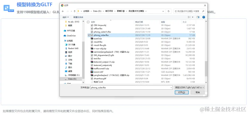 FBX转GLTF网站也支持通过拖拽的方式,将文件进行上传。在资源管理器中,选择一份或多份模型相关文件,拖拽至FBX转GLTF网站中的文件接收区域,即可完成3D模型文件的上传。