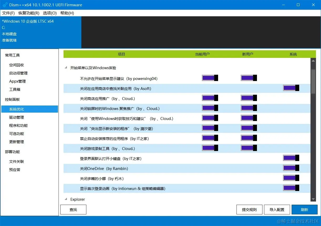 Dism++ 是一款 Windows 系统管理优化工具,它可以帮助你在软件上备份系统,还原系统,可以对过期的系统文件删除、可以对缓存文件清理,可以对临时文件清理,可以对启动项目禁止,提供的系统优化方案非常多。你只需要启动软件找到适合的功能就可以开始对系统优化,让你可以更好使用电脑工作。