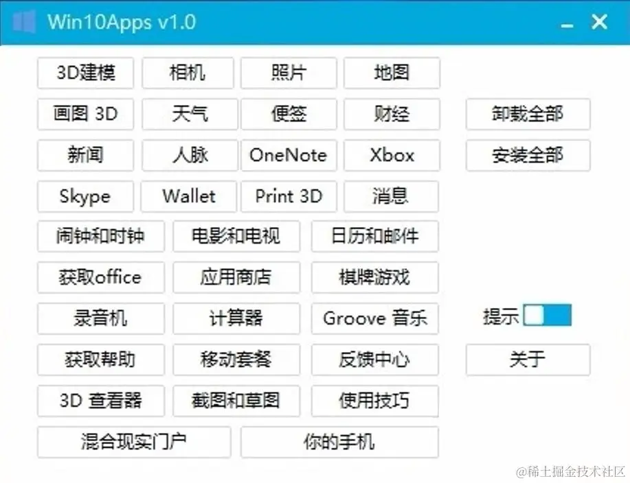 Win10Apps是一个免费的Windows 10系统App应用管理器,可以方便地卸载和重新安装Windows 10自带的应用,如3D建模、相机、照片、地图、画图3D等。该软件为单文件版,无需安装,直接下载后双击打开即可使用。