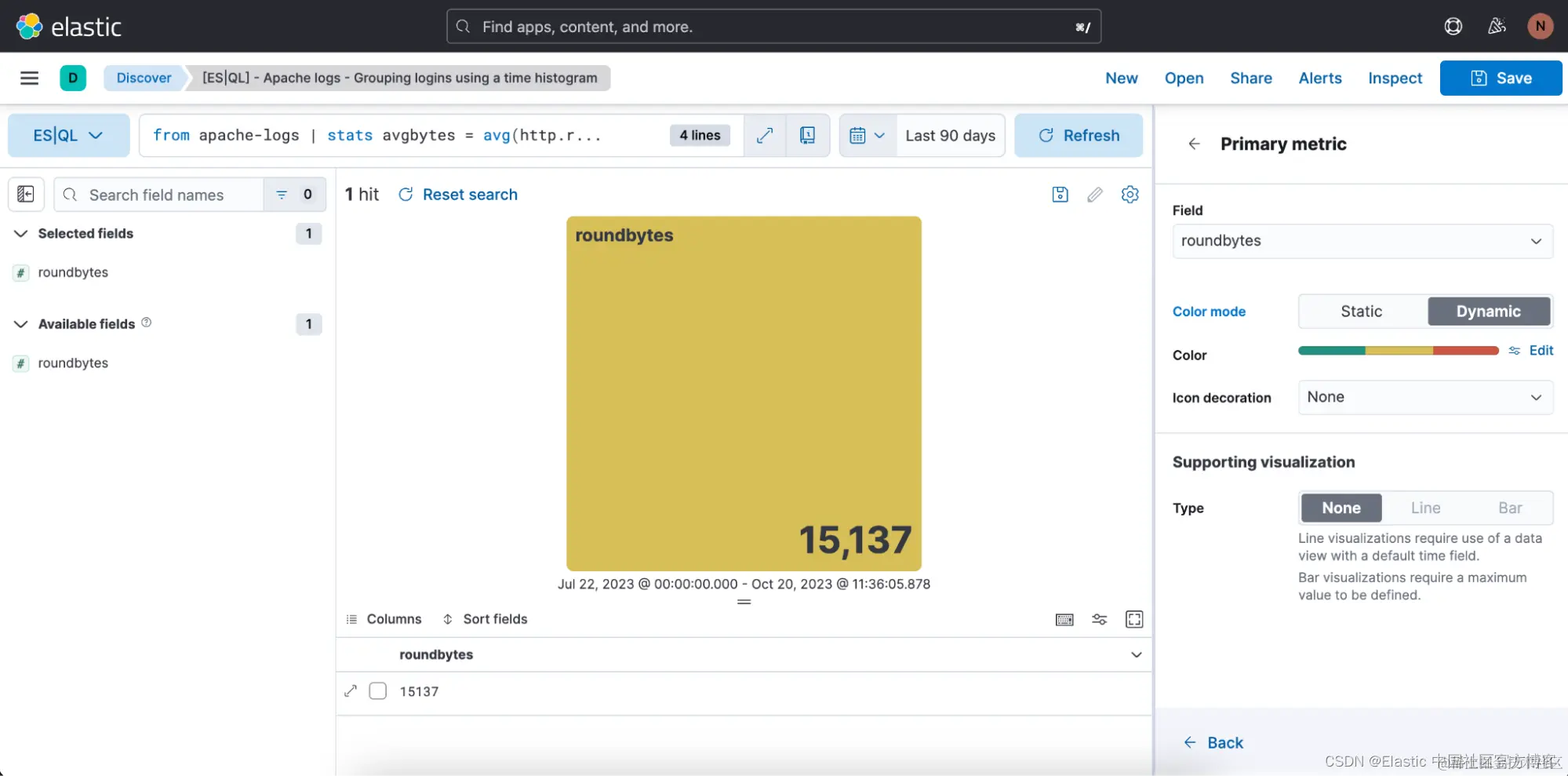 上下文可视化:在 Discover 中编写 ES|QL 查询时,你将收到由 Lens 建议引擎提供支持的视觉表示。 你的查询的性质决定了你获得的可视化类型,无论是指标、直方图热图等。