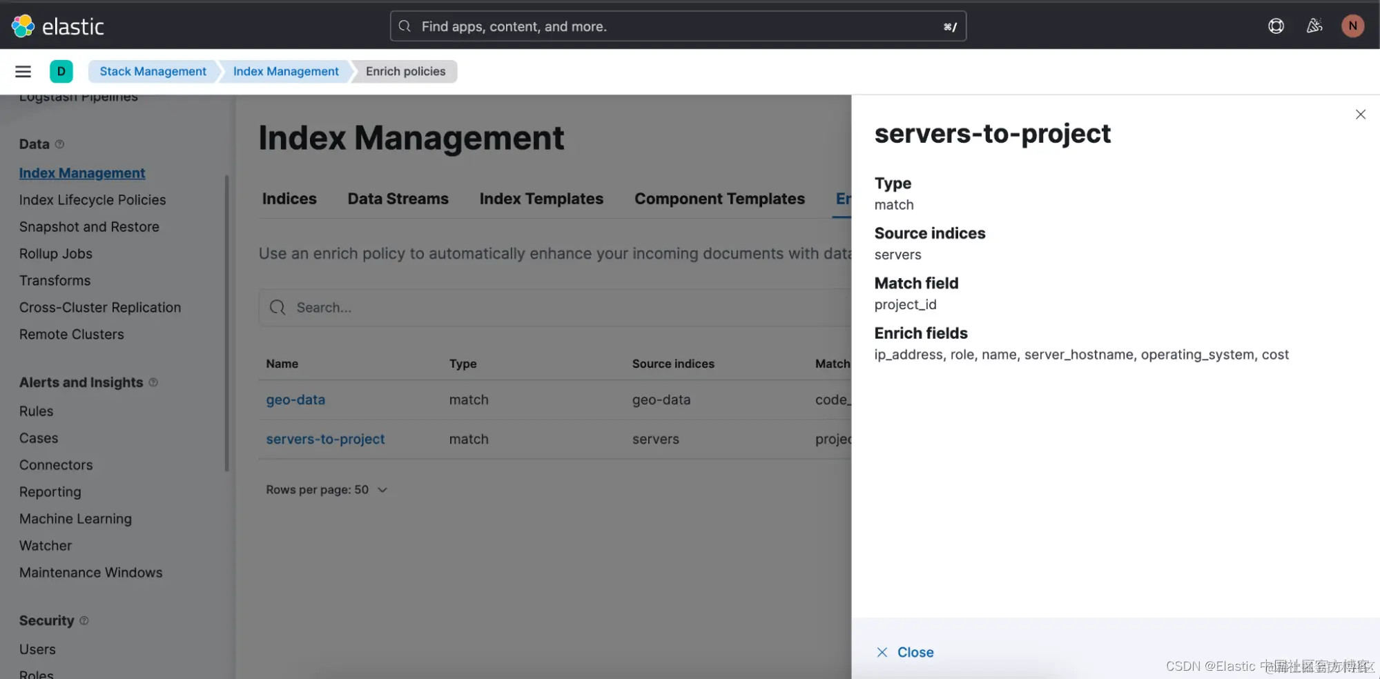 要查找丰富策略的概述,请导航到 Stack Management ⇒ Index Management,你将在其中看到一个名为 Enrich Policies 的选项卡: