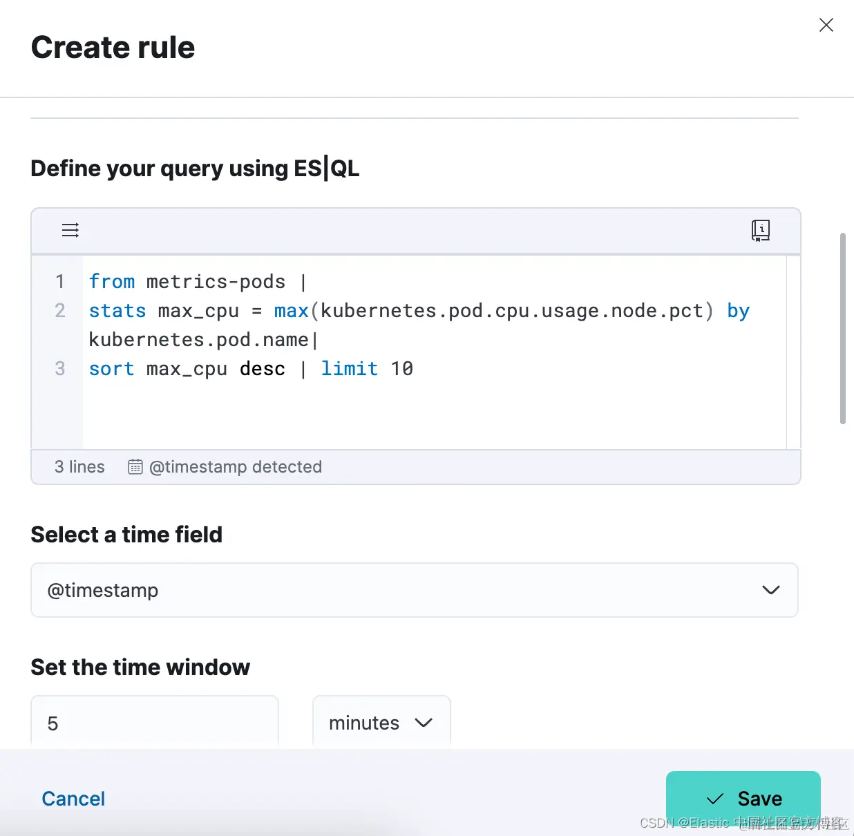 新的警报规则类型可在现有 Elasticsearch 规则类型下使用。 此规则类型带来了 ES|QL 中可用的所有新功能,并解锁了新的警报用例。