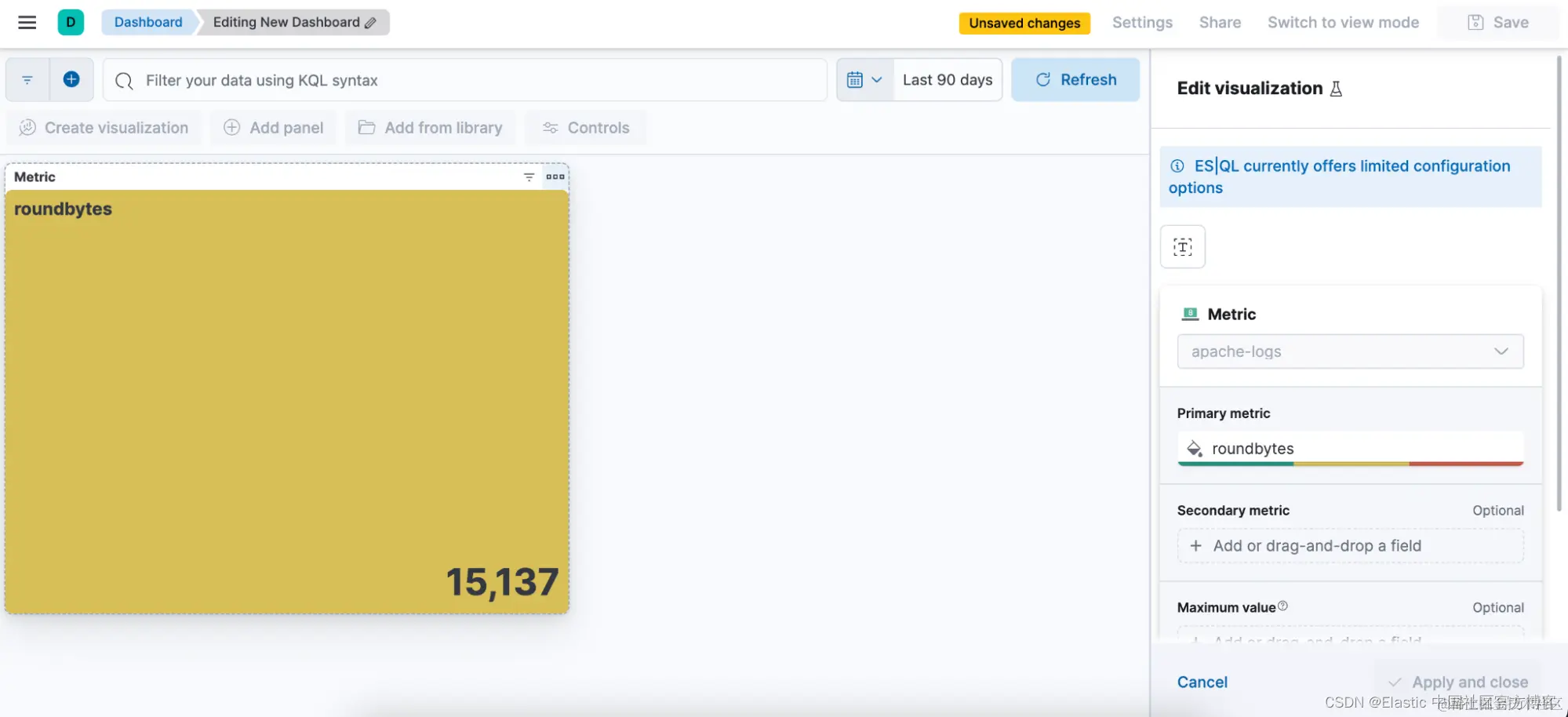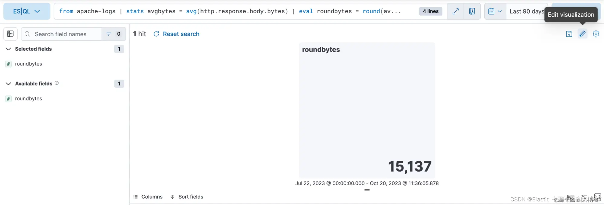 直接在 Discover 和仪表板中编辑 ES|QL 可视化。 无需导航到 Lens 即可进行快速编辑; 你可以无缝地进行更改。