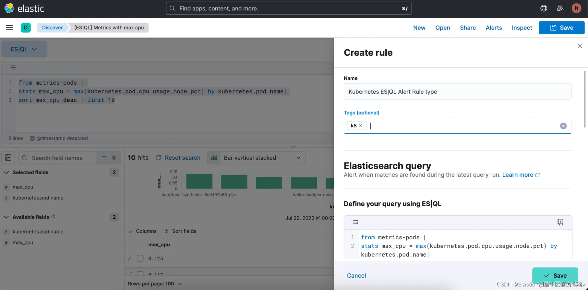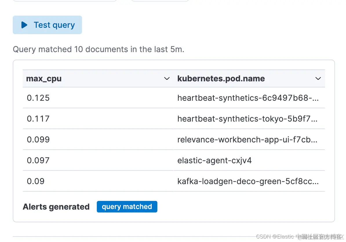 - max_cpu=max(kubernetes.pd.cpu.usage.node.pct):对于每个不同的 “kubernetes.pod.name”,它会查找最大 CPU 使用百分比并将该值存储在名为 “max_cpu” 的新列中。