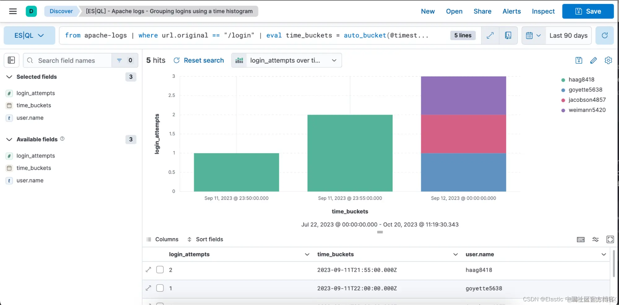 stats login_attempts = count(user.name) by time_buckets, user.name:聚合数据以计算登录尝试次数。 它通过计算 “user.name”(代表尝试登录的唯一用户)的出现次数来实现这一点。