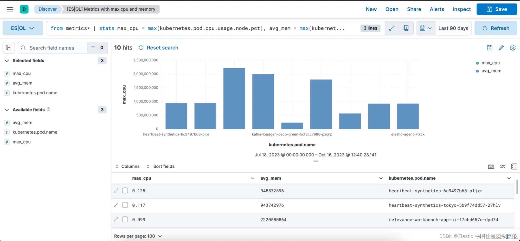 下面是上述查询的条形图形式的直观表示和表格表示,其中包含 max_cpu、avg_mem 和 kubernetes.pod.name 列: