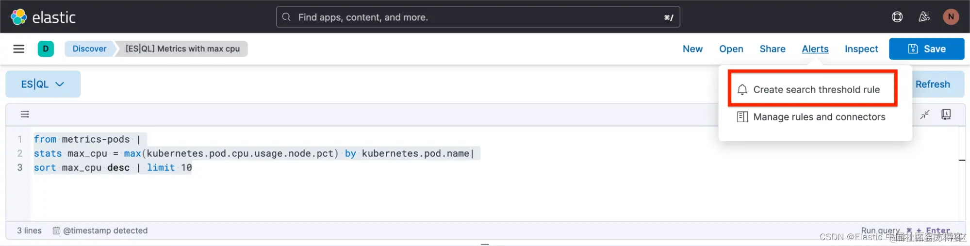 下面,我们将重点介绍如何从 Discover 创建 ES|QL 警报规则类型。