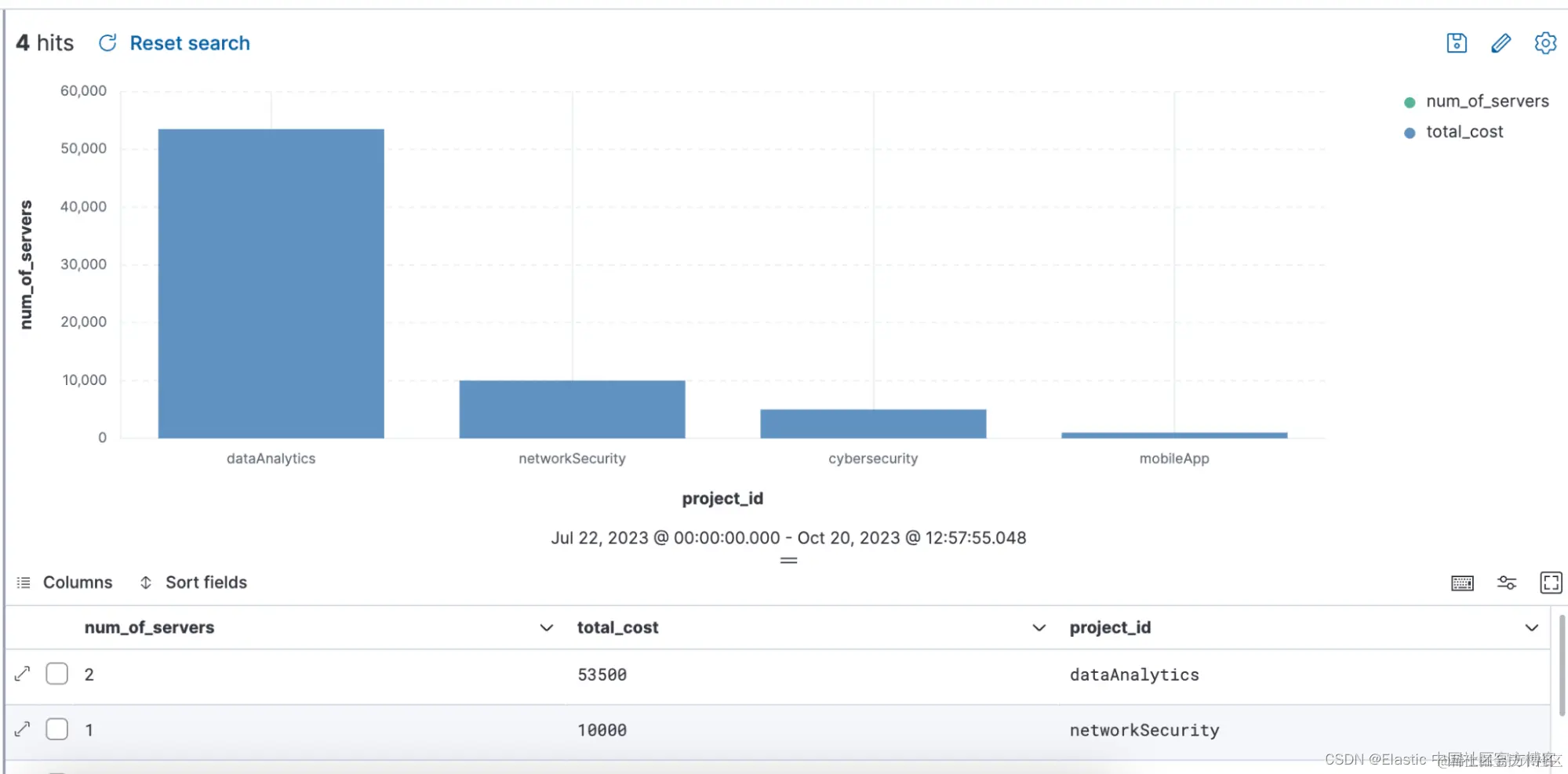 使用 ENRICH 的查询示例,其中通过查询使用丰富策略:“servers-to-project” 来通过 name、server_hostname 和 cost 来丰富数据集: