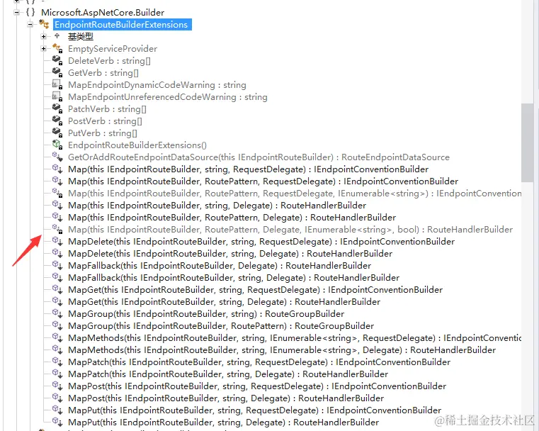 我们已经解释过 IEndpointRouteBuilder 的定义了,即为程序定义路由构建的约定。这次看到的是他的拓展方法 Map ,该方法是诸如 MapGet、MapPost、MapPut、MapDelete、MapPatch、MapMethods 的底层方法: