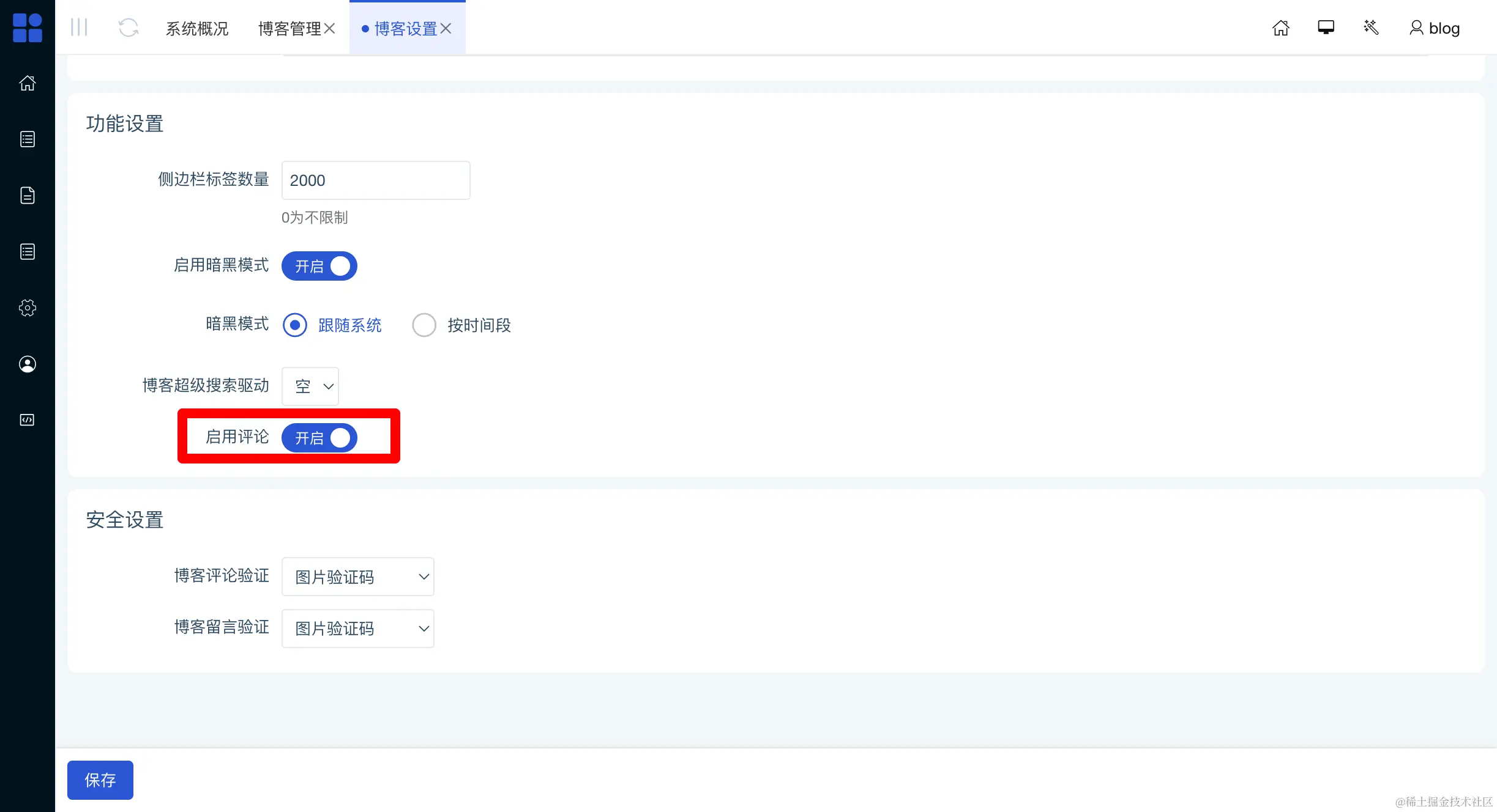 博客设置页面功能分区,新增博客评论开关
