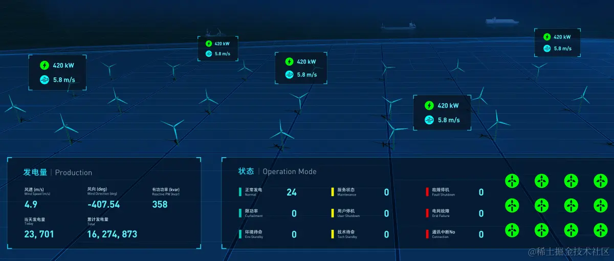 展示海上风电场运维中心及风电场总体生产运营信息,包括环境情况、实时指标、机组状态、环境参数、发电统计、风机数量等信息。